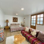 The home here is a two-story cabin constructed with a fusion of wood, rock, and adobe, exuding warmth and character. This charming retreat is complemented by an outdoor kitchen featuring an earthen pizza oven, perfect for culinary adventures amidst the scenic beauty of the surroundings.