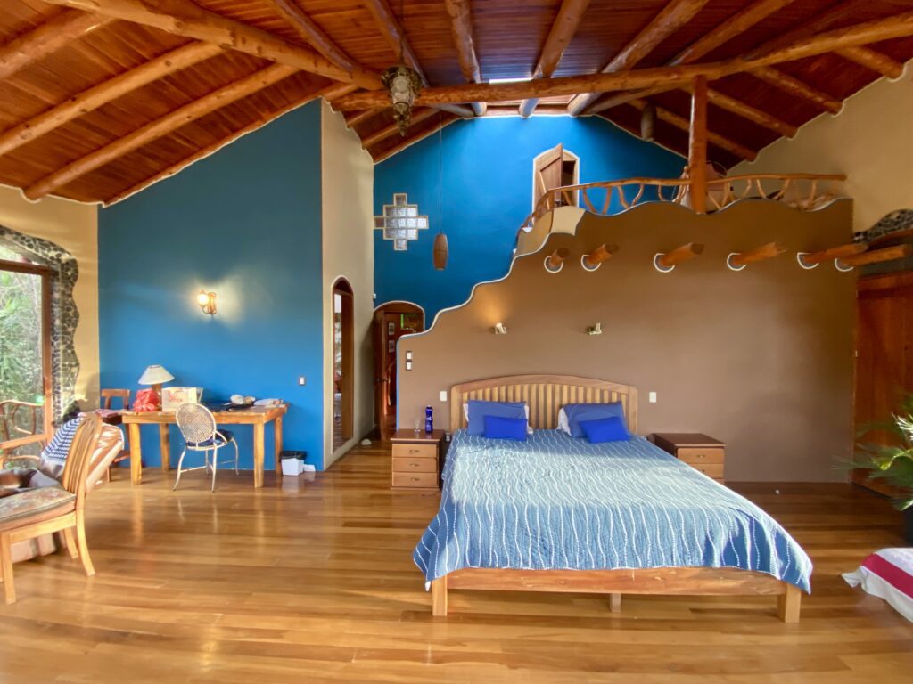 - The Red House is the largest and most elegant of the three. It features a spacious kitchen with granite countertops, a double sink, an island with a stove and oven, and two large pantry and storage areas. The open-concept design creates fluid spaces between the kitchen, dining area, and living/entertainment area, which is flooded with natural light from large picture windows on both sides. There is also a wooden bar area with space for 4-6 bar stools. Upstairs, the master bedroom includes an office wing, large windows, a wraparound balcony, a walk-in closet that doubles as a safe room, and a luxurious en-suite bathroom with a jacuzzi tub, bidet, and shower. The house also includes a loft space, additional 2+ bedrooms, 3.5 total bathrooms, and a large covered patio perfect for enjoying the valley views. There is also a large storage room that could be turned into a 4th bedroom or a caretakers suite with its own separate entrance as it also has a door to the outside.