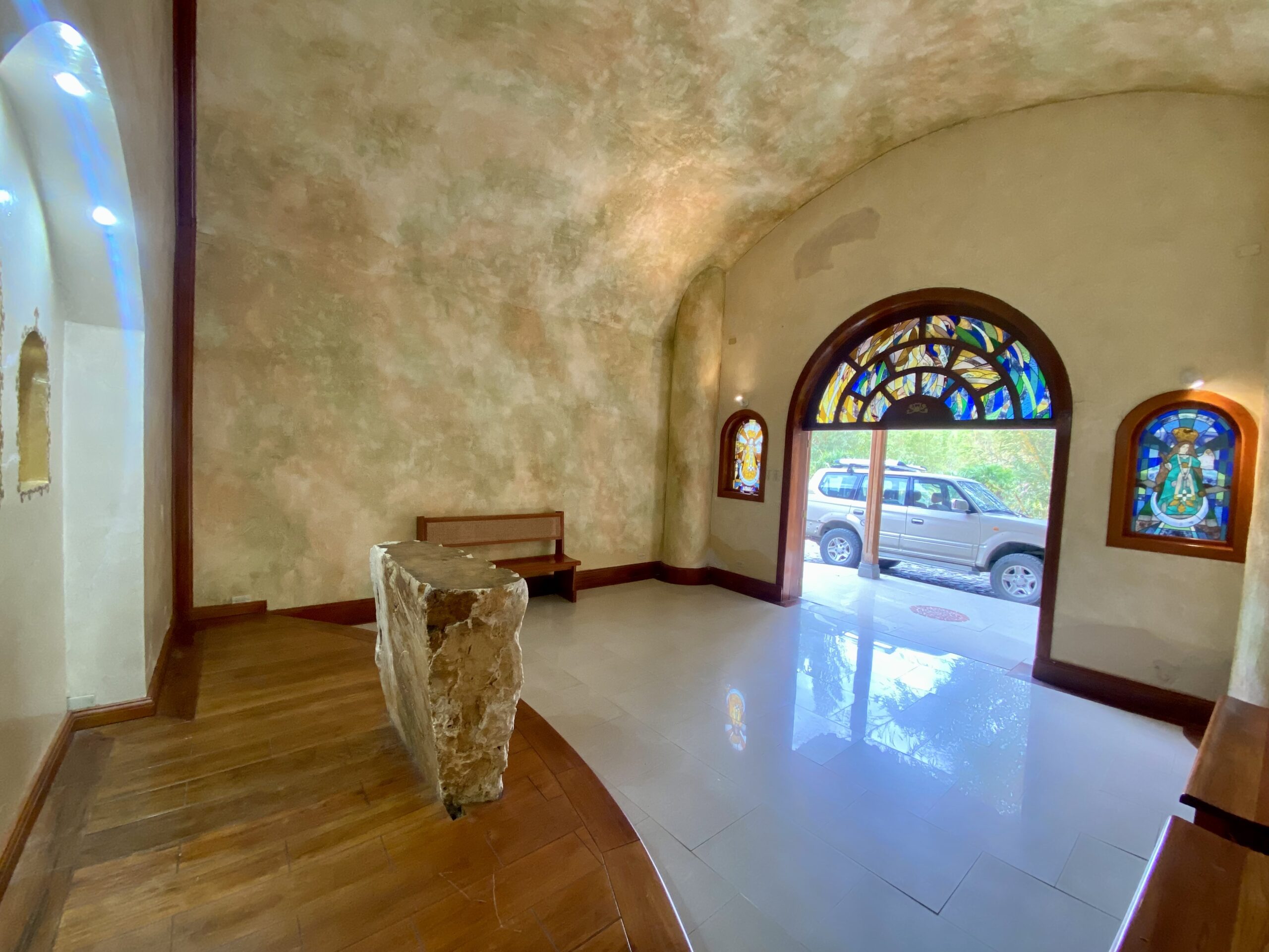 - A large open room with a giant tiled floor and high ceilings.