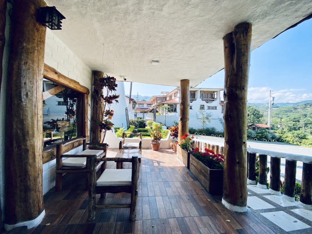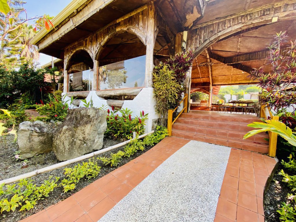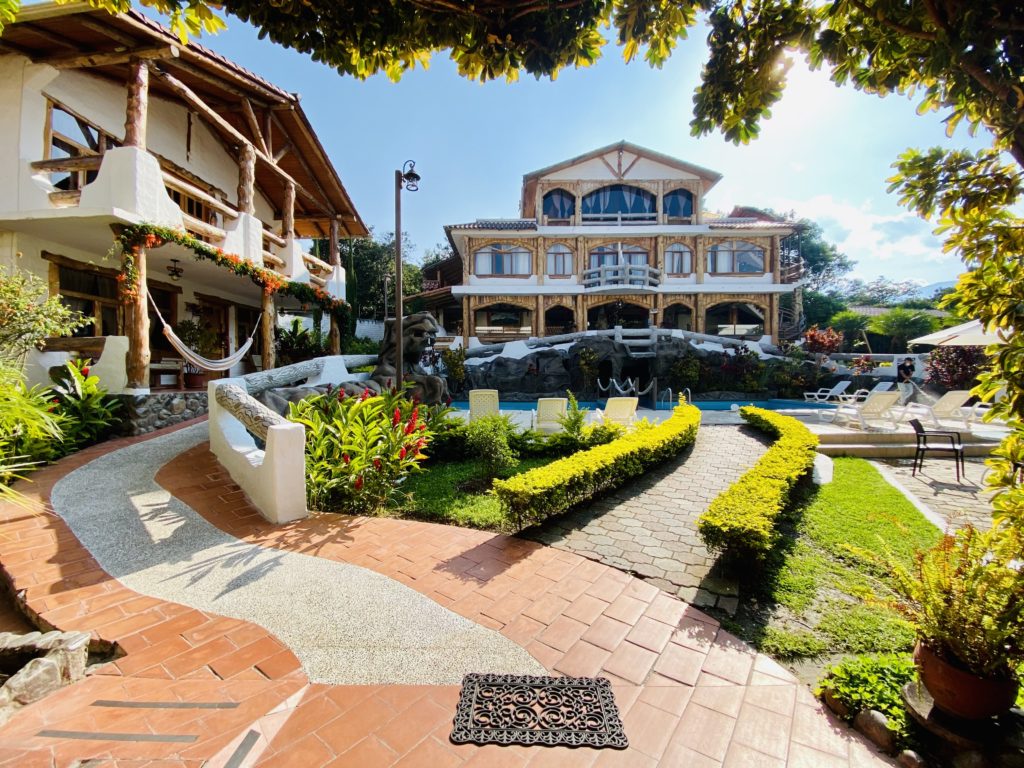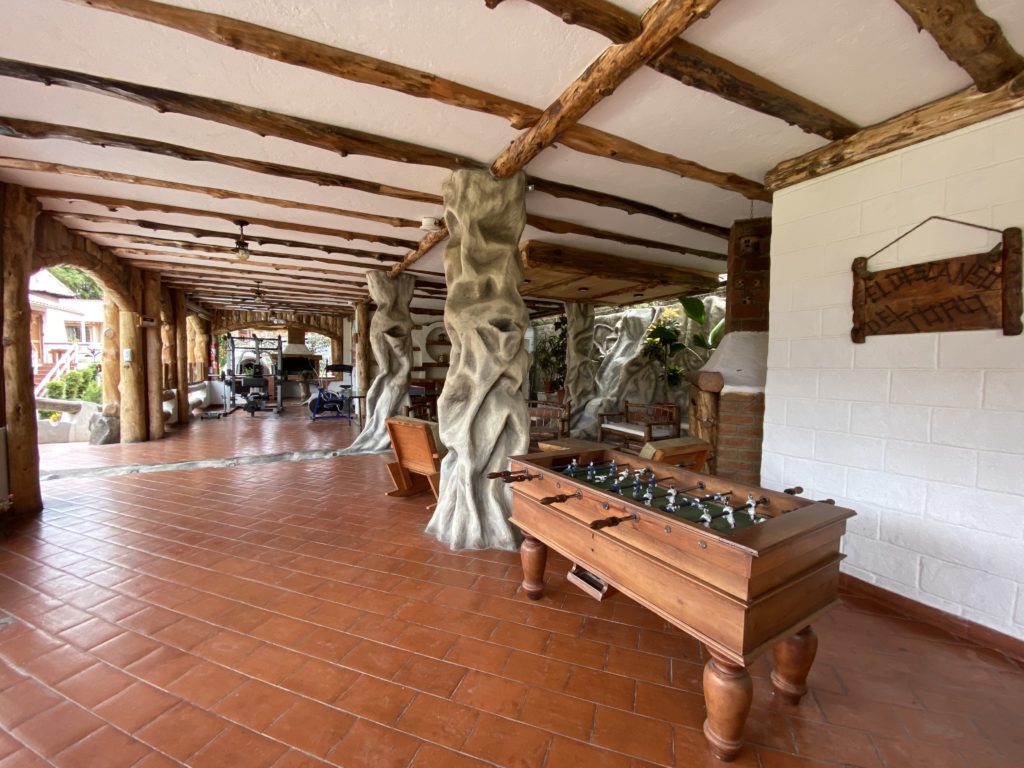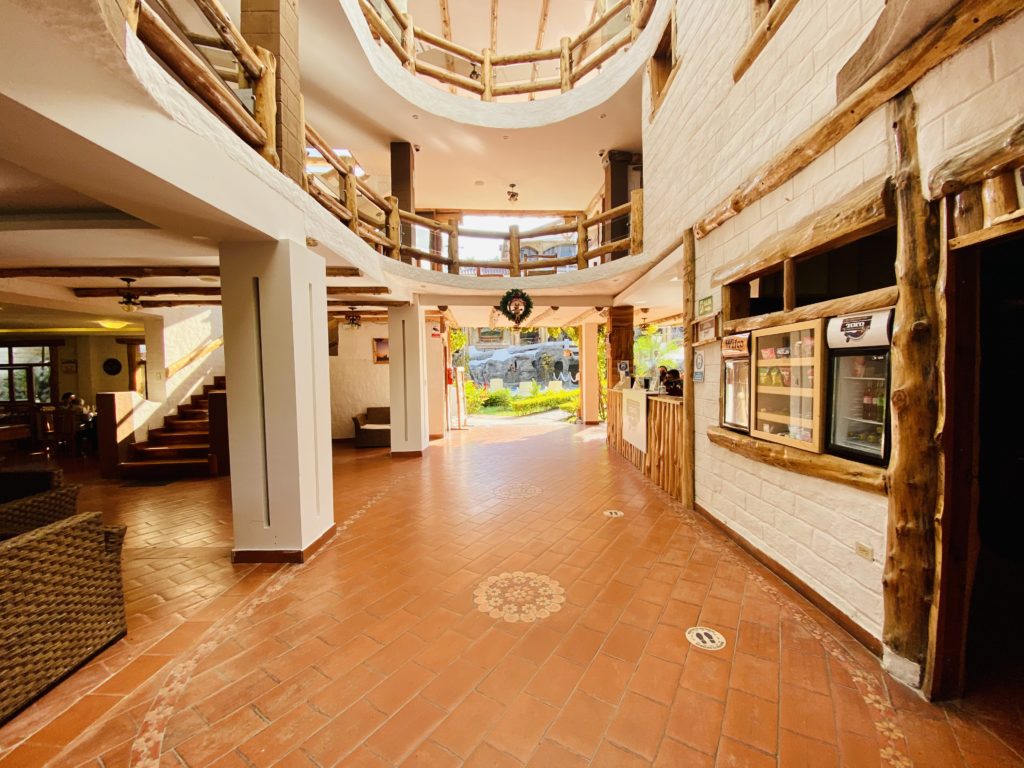 At the entrance of the property there is a public restaurant -brewery with its own heated pool (with slide and waterfall), jacuzzi, playground, a large conference room, and offices. This recreational area & restaurant (with a capacity for about 140 people) is available to patrons for day use for those guests that are not staying within the hotel. This entry operation has been functioning as a very lucrative business in addition to the hotel. Please contact Tara directly to see the past profits and numbers from this successful enterprise as well as the books of the hotel and events center. Old growth trees adorn the windows and terraces of this initial structure & have been incorporated into the building’s design (instead of being cut down). The abundance of plants, flowers and these trees decorating this entry building makes for a very inviting indoor/outdoor venue. This restaurant boasts upper balconies branching off of the indoor seating upstairs with adjoining conference rooms and offices, there is also a mid level terrace, and a large lower deck with views to the pool, gardens, and the famous Mandango mountain. Inside the restaurant there is a grand room with high ceilings, a stage, and capacity for around 65 people. A stone fireplace compliments the wooden features within this impressive and homey adobe construction. This entry business has its own large parking lot in addition to the parking for the hotel and events center behind.