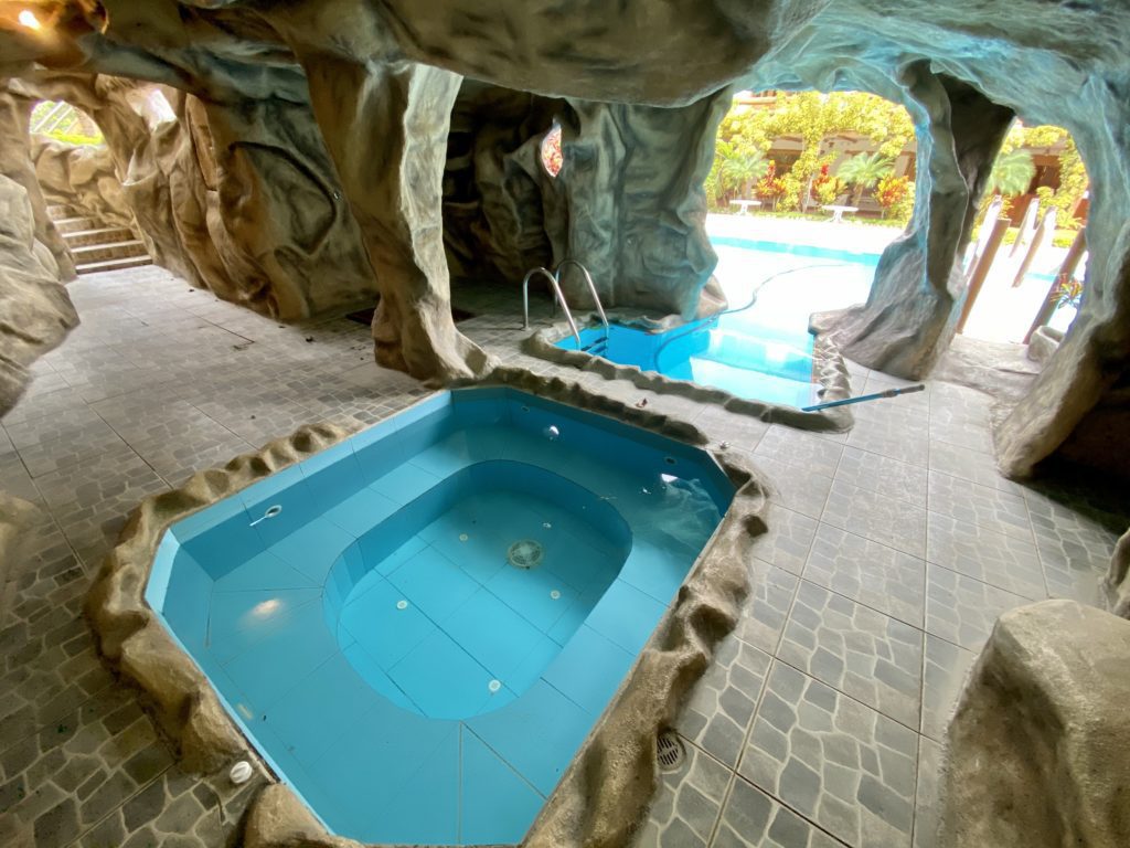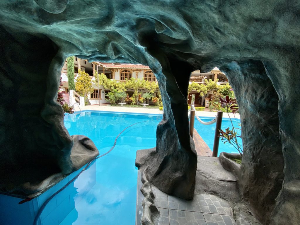 The hotel consists of four connected buildings surrounding an internal court yard with gardens, a playground, a large heated pool with waterfall, a hot tube inside a cave, and a steam room. There is a giant penthouse suite on the top floor of the tallest building with views to the west; this building also has additional guest rooms on the middle floor, and restaurant/game room-terrace below. Throughout the hotel buildings there are a total of 26 rooms, 15 of which have their own private large indoor jacuzzi tubs, and many with their own balconies and/or shared terraces. Within the entry lobby there is a reception desk, a seating area/living room, and a dining room with pool (billard) table.