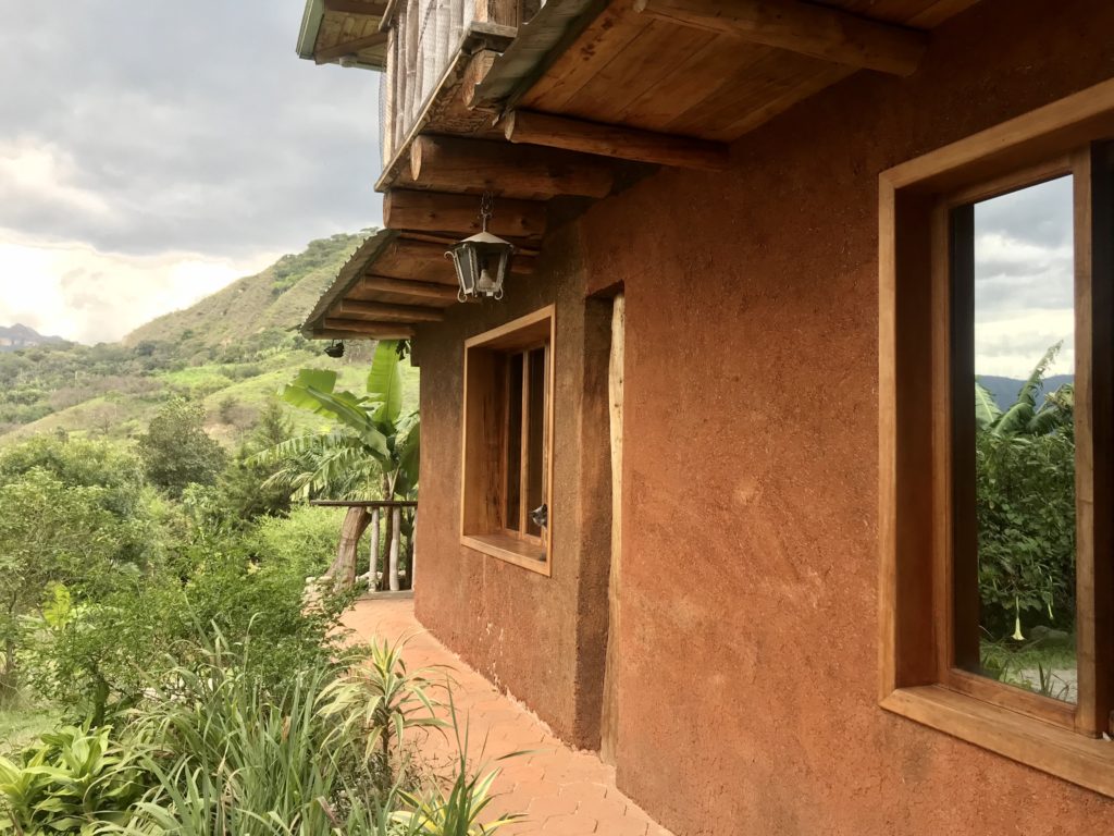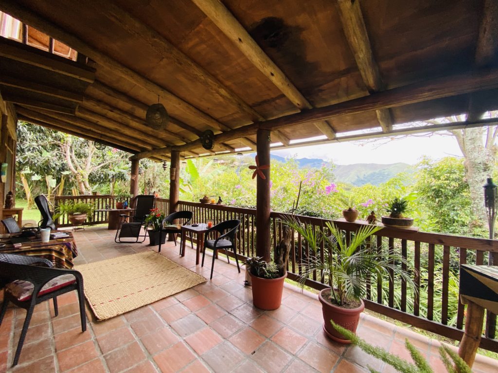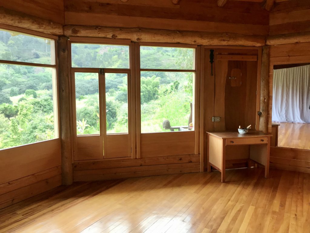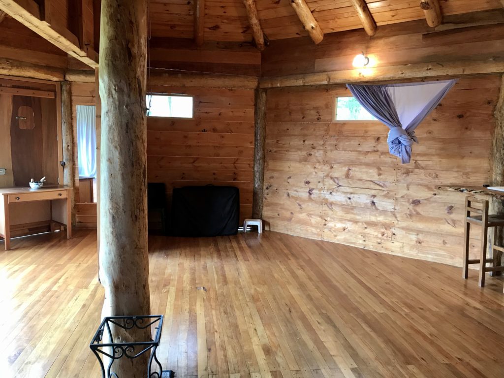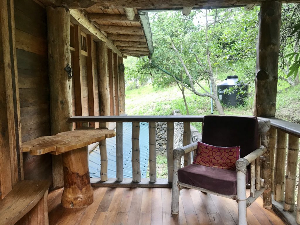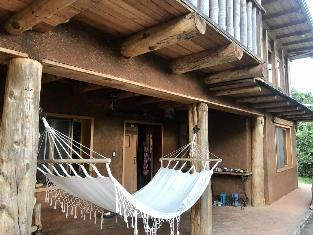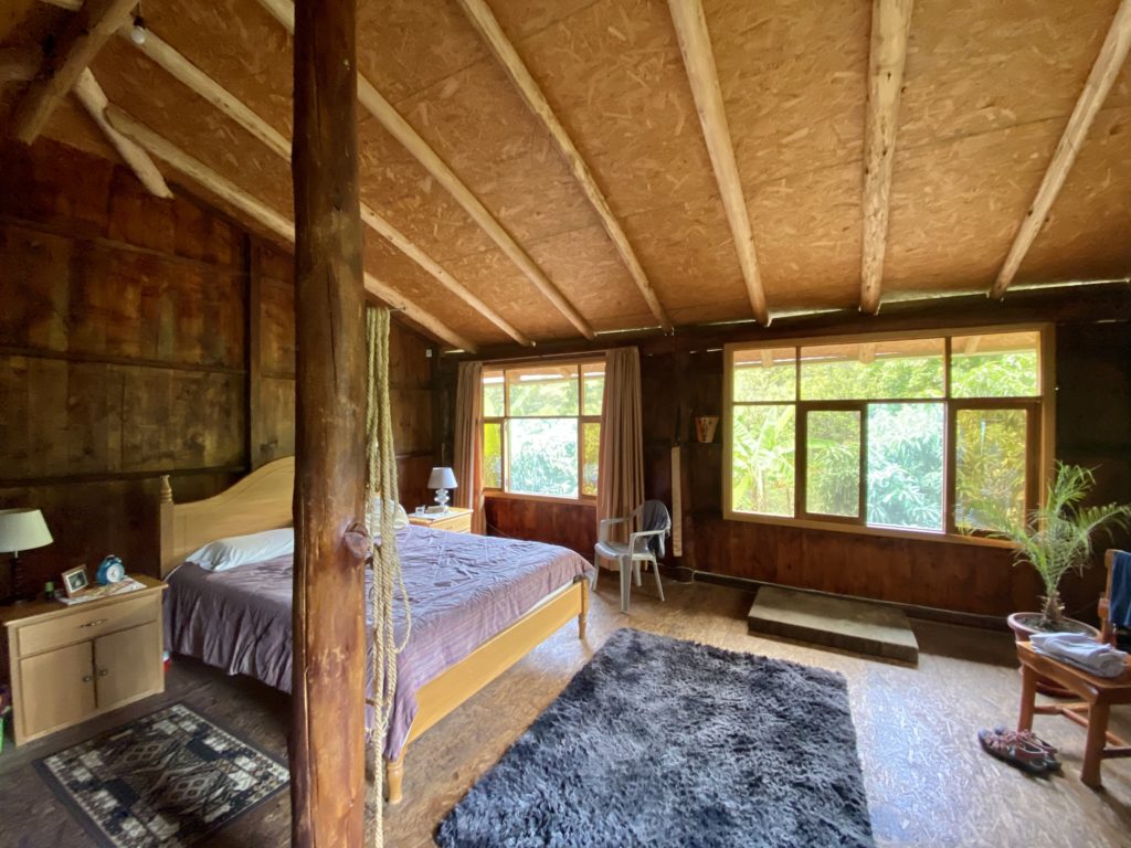 The upper floor of the main house has one bedroom, one bathroom, kitchen, and a giant room that could be used as a living room, yoga studio, dance floor etc. There is a nice covered sitting area outside of the entrance to this second floor at the top of the outside staircase. This upper floor is gorgeous, made of all pine, and the windows view the famous Mandango Mountian, the Andes, and out onto the little mountain valley where this property is located.